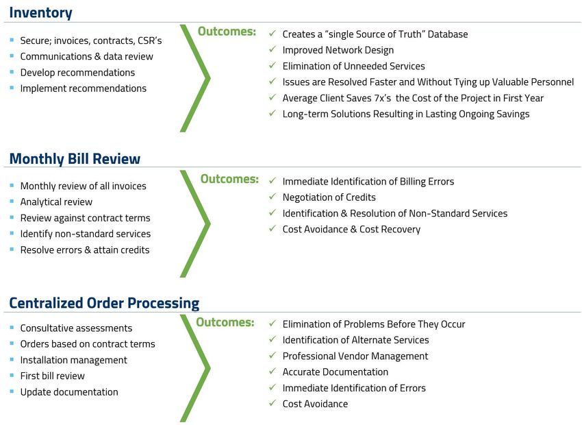 Spend Management provides resources that address the administrative responsibilities of communications. Spend Management pays for itself both in terms of direct reduction of your communications expense and improved efficiency. A dedicated team of professionals whose sole purpose is to scrutinize your bills, systems and services to identify opportunities to both improve your service and to reduce your cost.